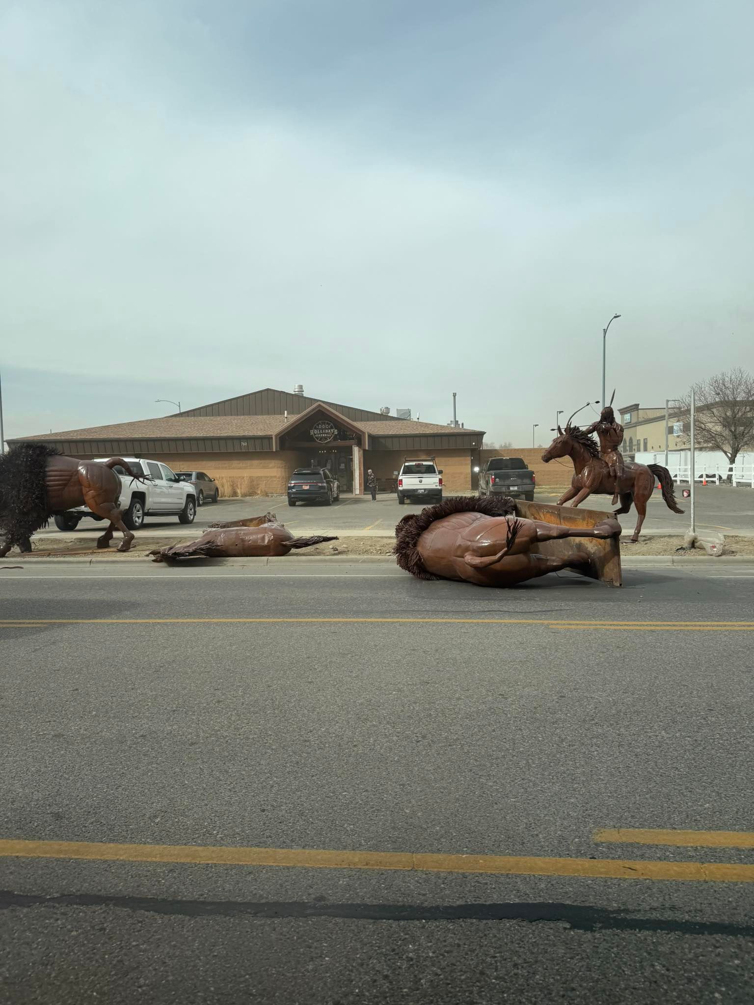 The National Weather Service branches throughout Montana were warning of very high wind gusts, and most of us were feeling it across Montana. In a corridor stretching from Baab to Augusta there were wind values ranging from 70 to 95 mph. Even in Billings, the wind was wreaking havoc, causing problems, including the newly installed sculptures of bison at Doc Holliday’s. This picture comes to us courtesy of Hot 101.9